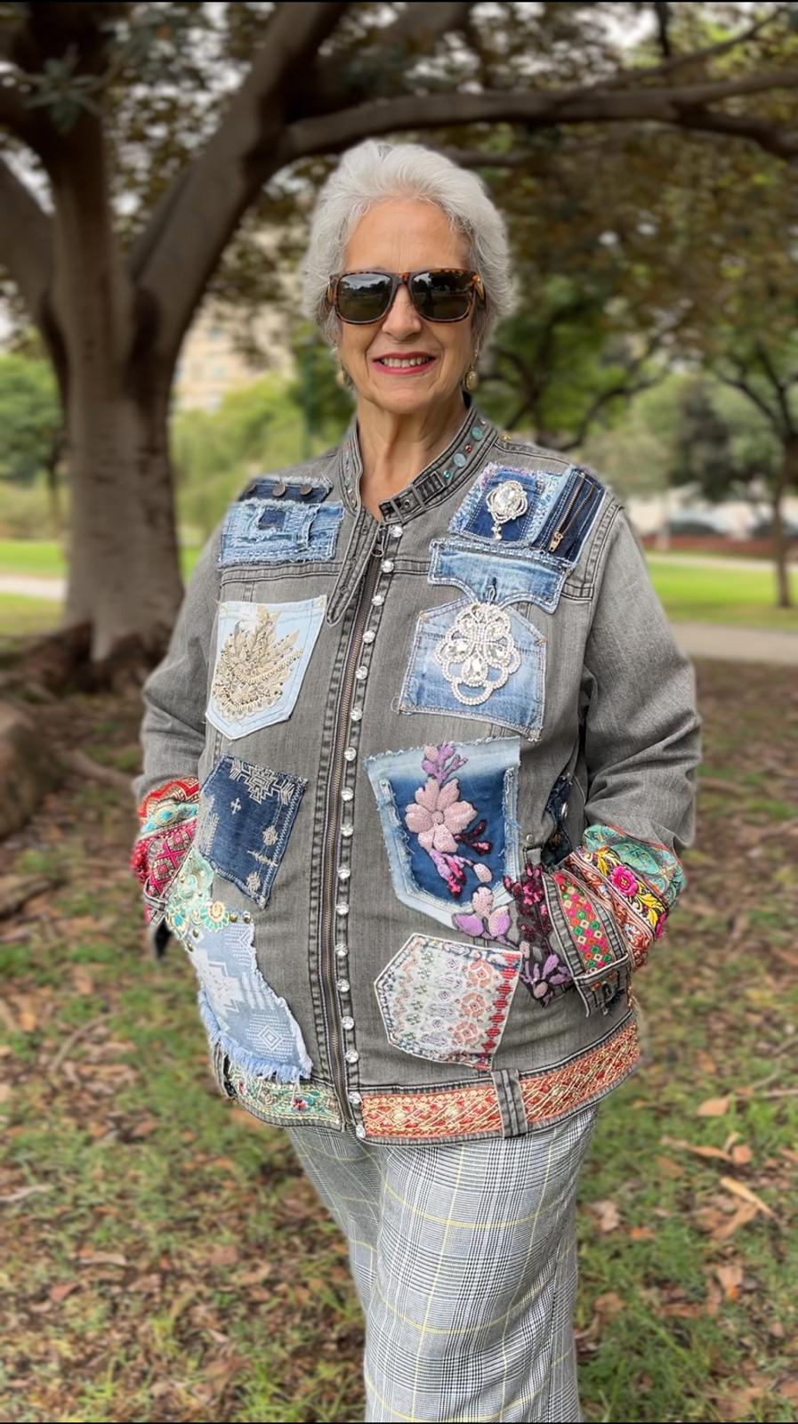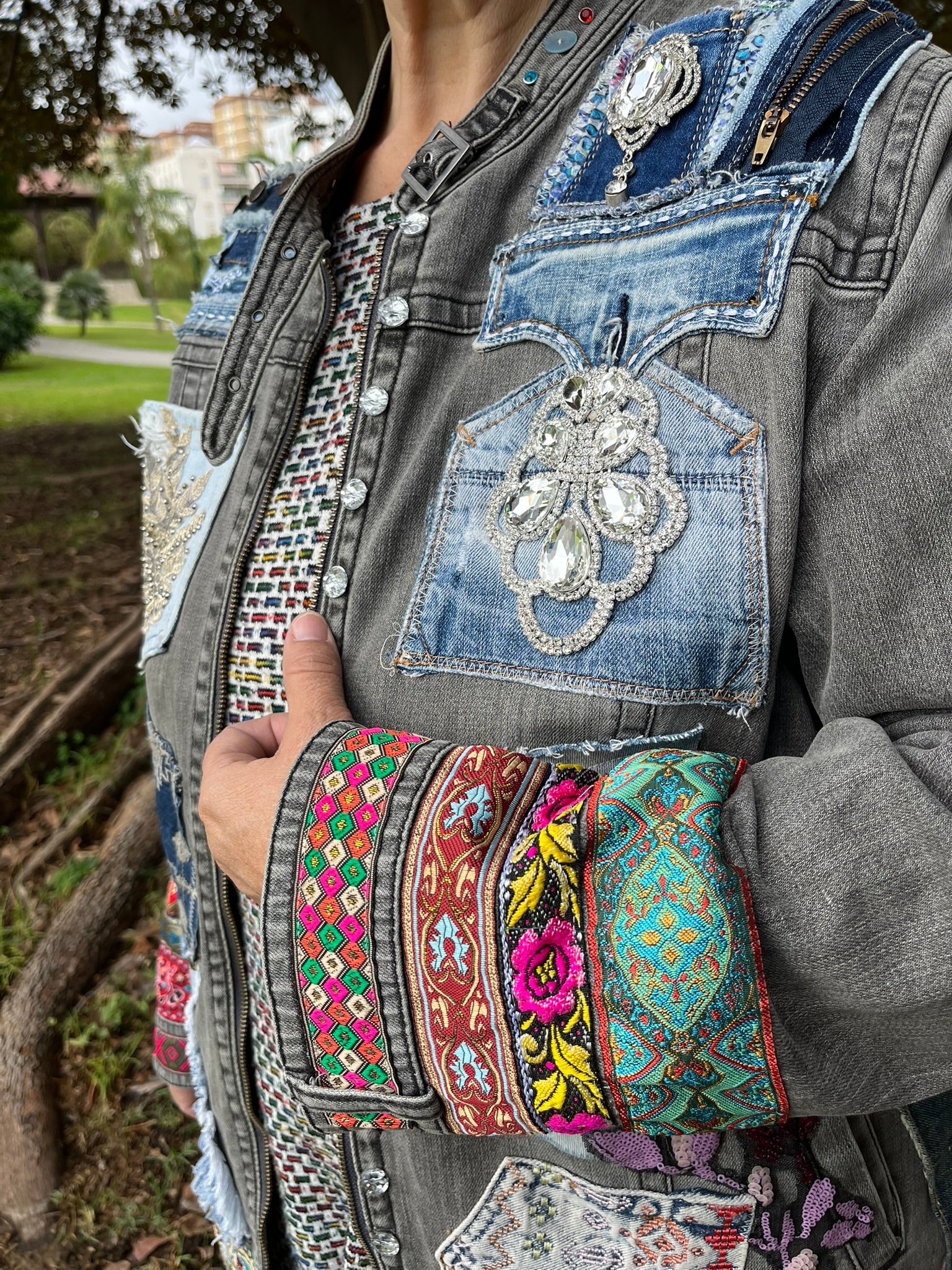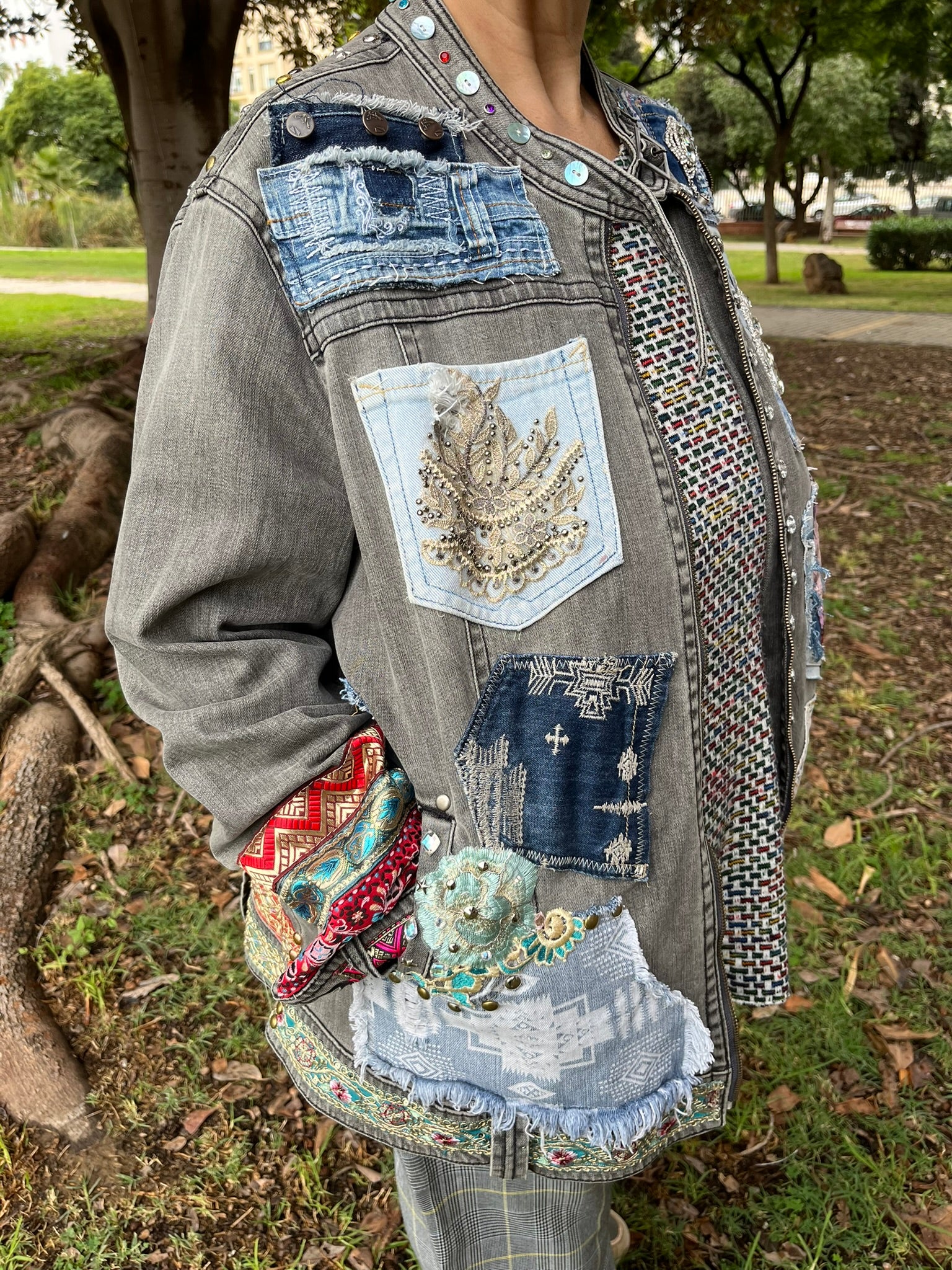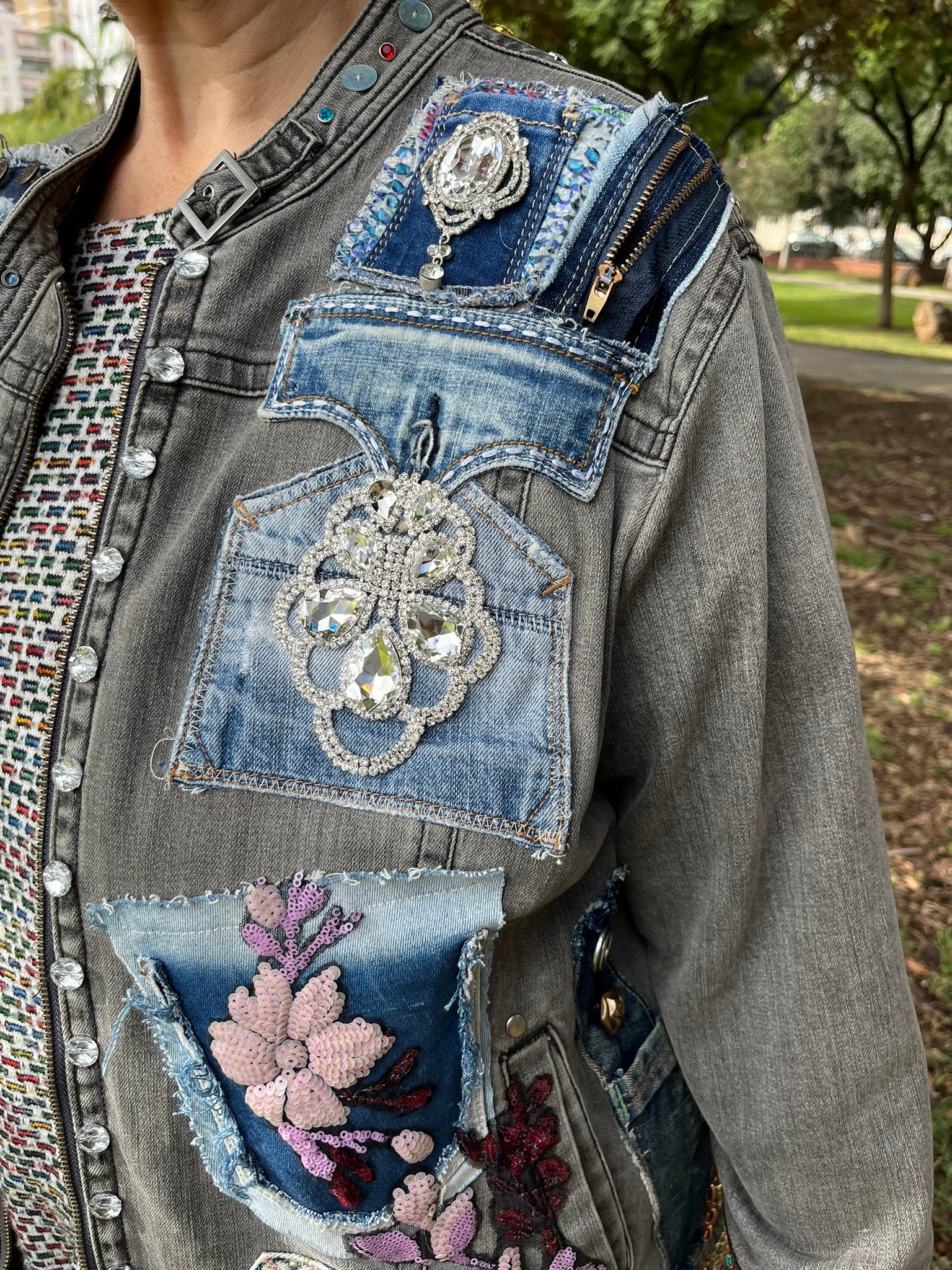 Redil es una chaqueta gris es creatividad pura. Un diseño artesanal transformado con trozos de denim reciclado, encaje bordado con abalorios de cristal, tachuelas y botones acrílicos cosidos a mano.