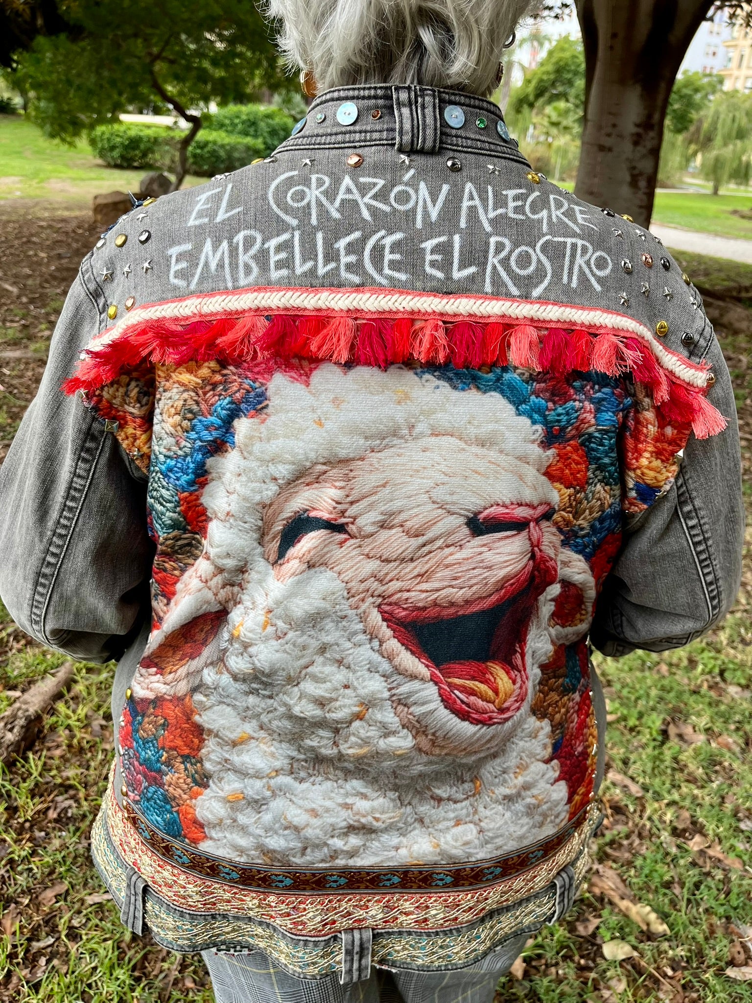 La espalda es una obra textil: una oveja de tela suave, flecos de colores, tachuelas y frase pintada a mano.