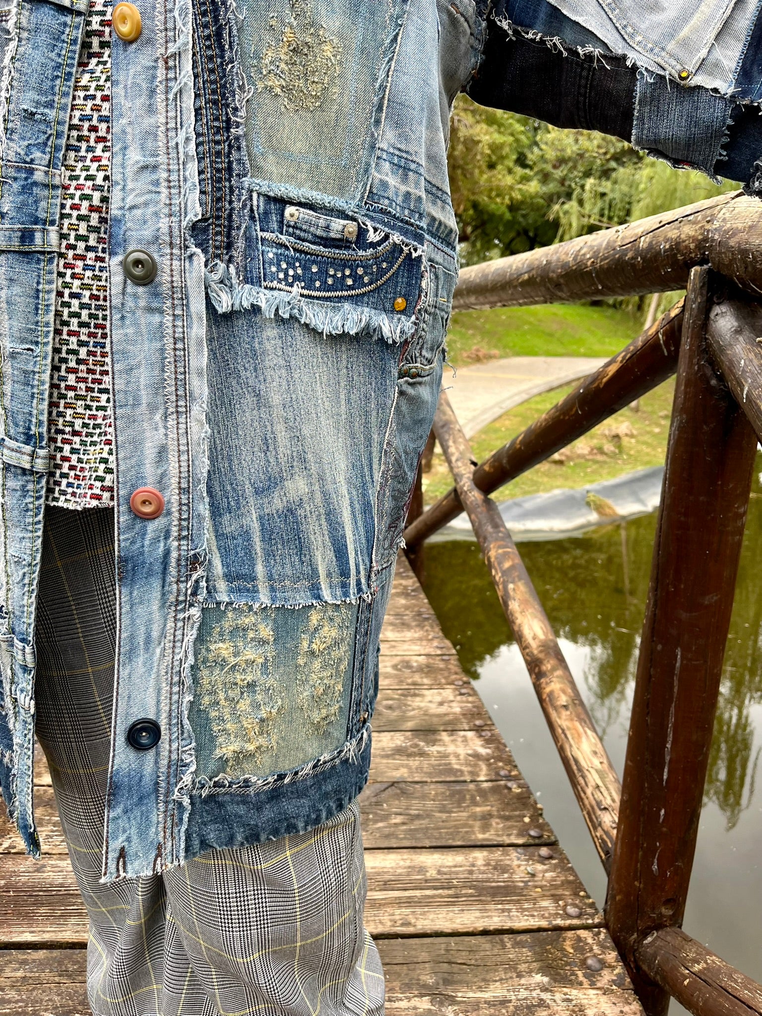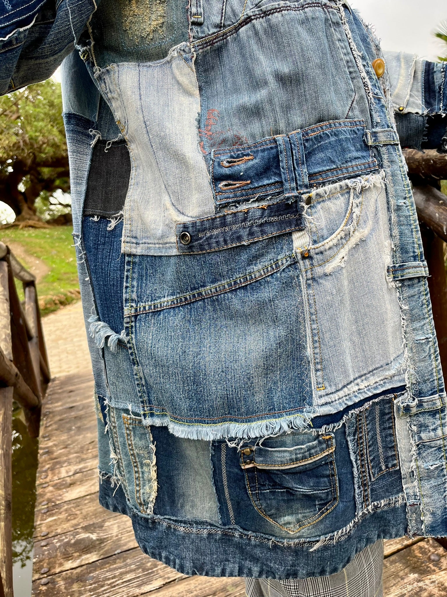 Sueños es un chaquetón largo es una obra textil creada a partir de retales de denim de varios colores, unidos a mano para formar una prenda única.