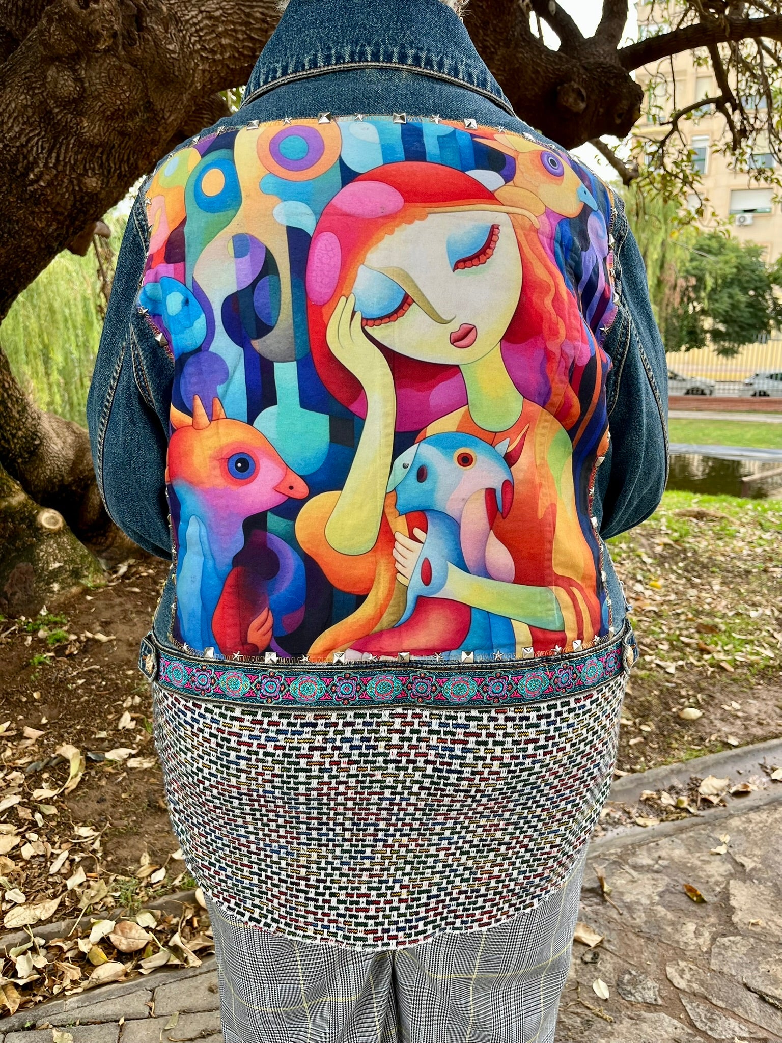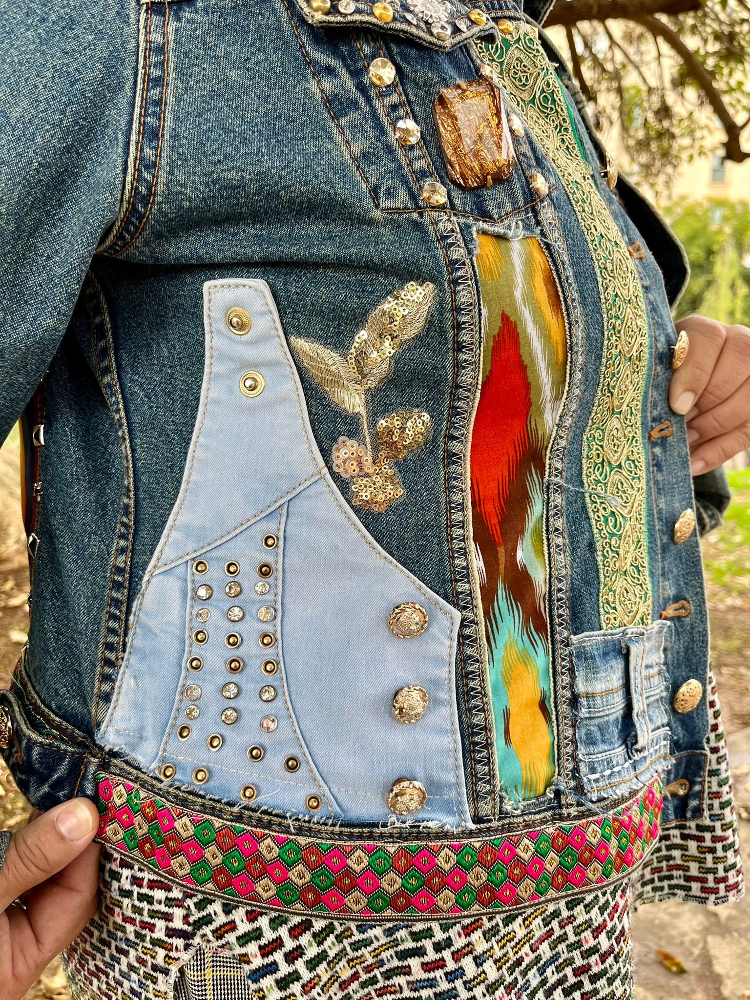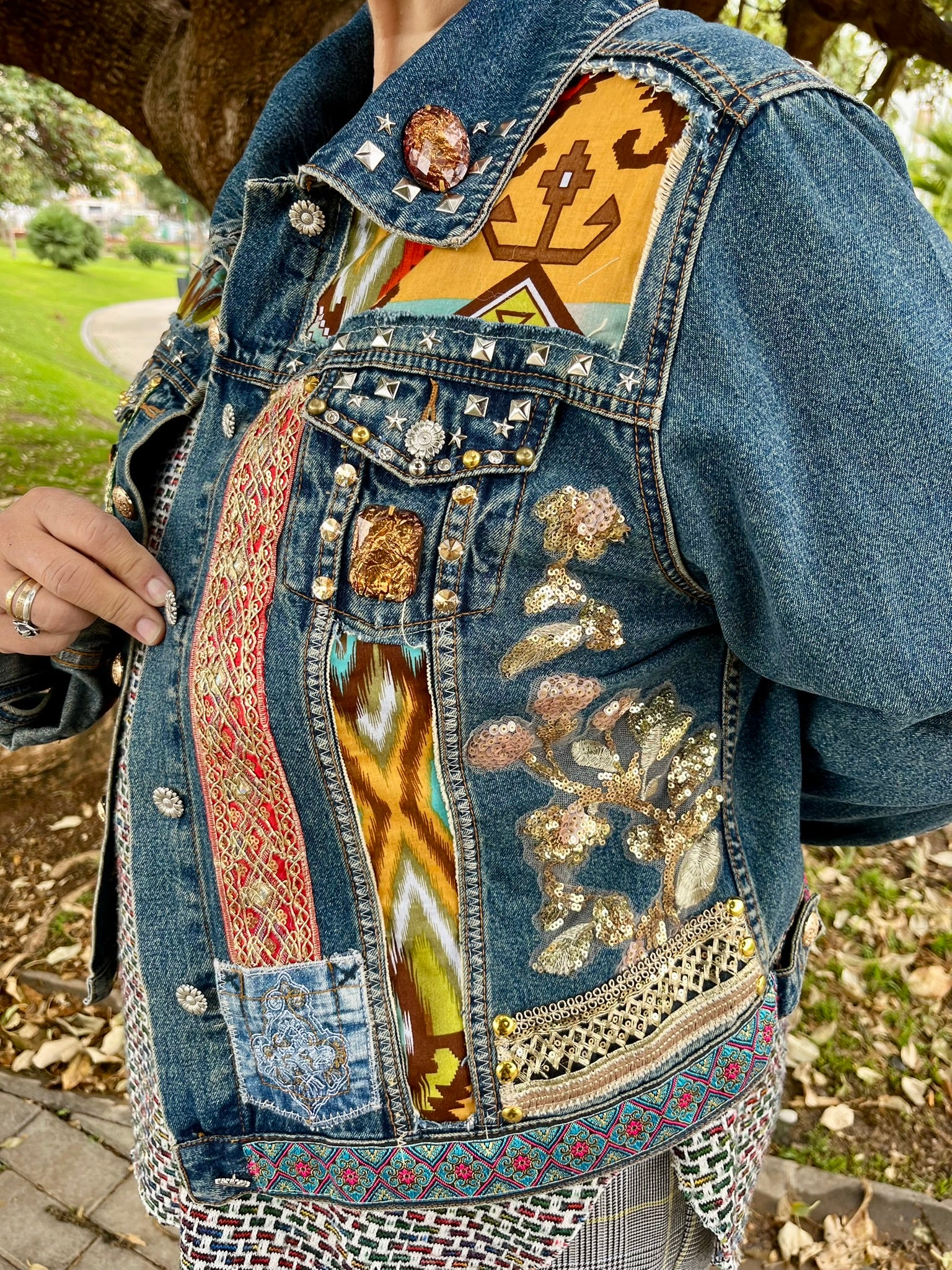La espalda incluye un cuadro textil rodeado de tachuelas y aplicaciones doradas, convirtiendo la prenda en un tesoro artesanal.